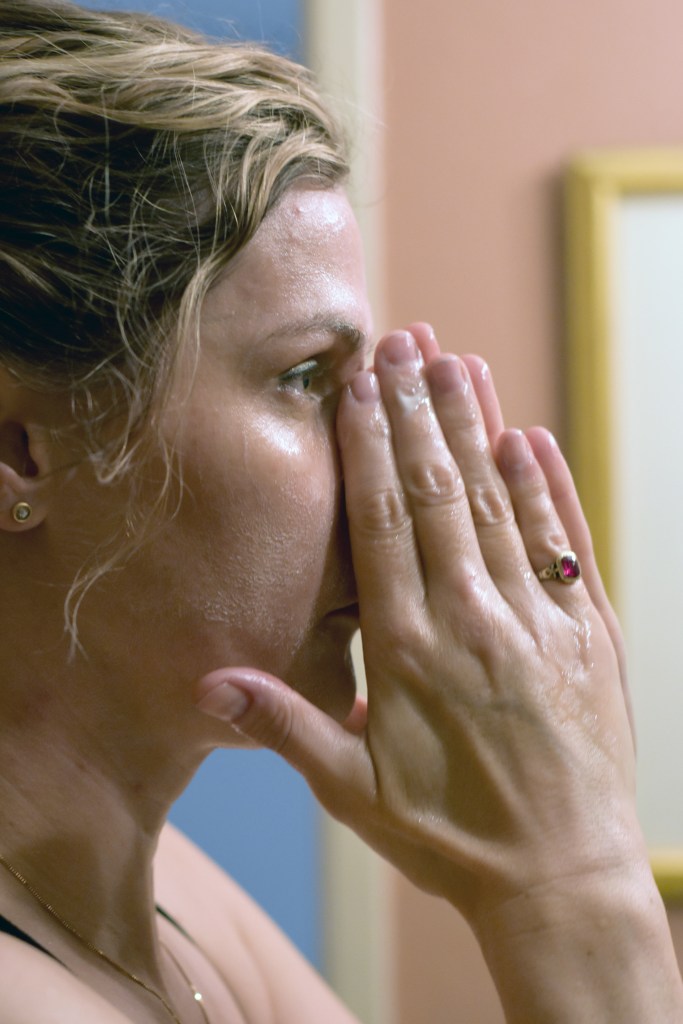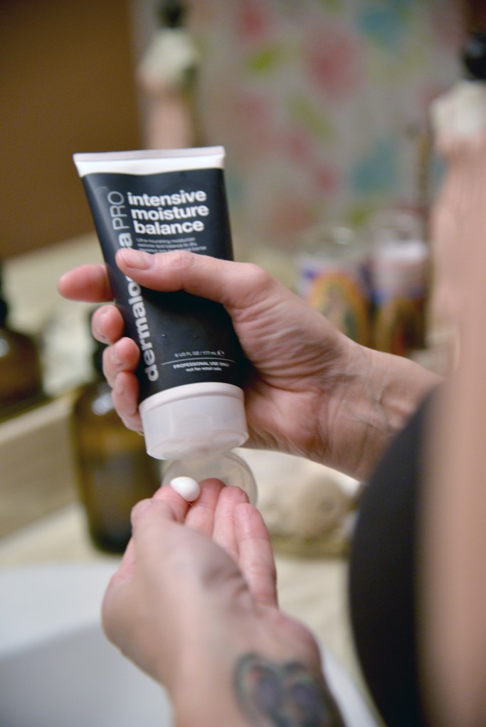 I close the bathroom door (trapping as much steam as possible at the bath fills). I fill a hot bath and add a tsp of oil. I use sweet almond oil, but coconut, olive, avocado… anything will work. While the bath is filling, I start with Dermalogica’s Precleanse on dry skin. I massage it into my skin the entire time the bath is filling. This gives the cleanser a thorough chance to melt all the gunk that collected on my face during the day (make-up, sunscreen, pollution). Just about the time my bath is ready I add a little water to the Precleanse and continue to massage my face to emulsify the Precleanse. When the bath is ready, I follow with a second cleanse using Dermalogica’s Intensive Moisture Cleanser to help alleviate my naturally dry skin.